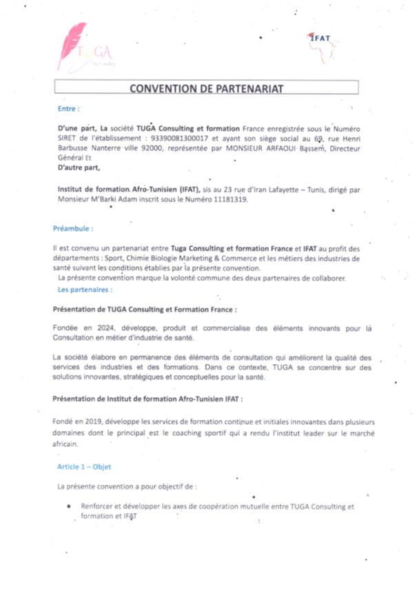 Télecharger Agrément de TUGAD'une part la société TUGA CONSULTING et FORMATION France enregistrée sous le numéro SIRET de l'établissement: 93390081300017 et ayant son siège social 69, rue Henri Barbusse Nanterre ville 92000, représentée par Monsieur ARFAOUI Bassem Directeur général et d'autre part, Institut de Formation Afro-Tunisien (IFAT), sis au 23 rue d'Iran La Fayette-Tunis dirigé par Monsieur M'Barki Adam inscrit sous le Numéro 11181319